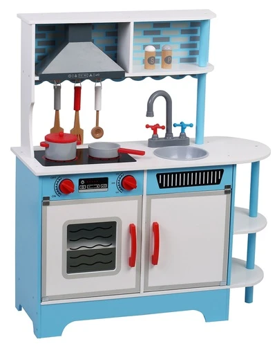 מטבח מעץ לילדים בצבע כחול ולבן כולל סט סירים ומכסה, כפות עץ, סט מלחיה – פלפליה .