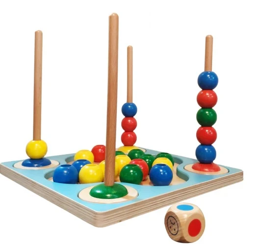 משחק הכולל לוח עץ, חרוזים בצבעים שונים, 4 עמודי השחלה וקוביה עם צבעים