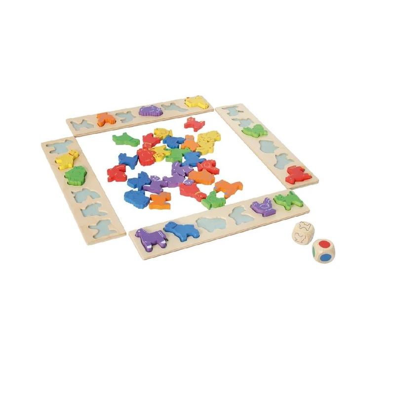 המשחק מכיל: 4 לוחות עץ תואמים, 36 חלקי חיות עץ, 2 קוביות. מגיע עם שקית כותנה לאחסון