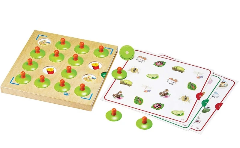 חלקי עץ בצורת 'פטריות' ירוקות וכתומות נכנסות למגש הלוח משחק ומורמות בקלות על ידי אצבעות קטנות של הילדים בעת המשחק, בעוד מספר כרטיסים מתאימים למטה – מציעים המון אתגרי זיכרון בנושאים שונים – כגון חרקים, תחבורה, אוכל וכו'…