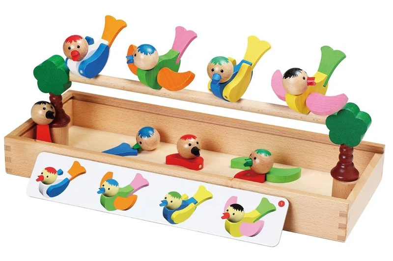 ערכת עץ הכוללת כרטיסים הממחישים שילובי צבעים שונים שהילדים עוקבים אחריהם כדי לבנות ציפורים שמחות שונות